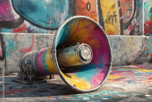 Colorful urban graffiti surrounds an abandoned megaphone on a vibrant street in the heart of the city