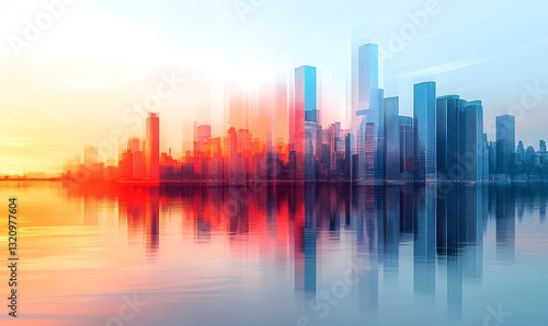 city landscape, sunrise, city, skyline, urban, water, building, skyscraper, modern, architecture, vibrant, colours, abstract, digital, art, photo, graphic, design, landscape, panorama, view, waterfront, harbor, downtown, morning, evening, light, colourful, impressionistic, blurred, motion, sunset, horizon, skyscraper, river, bay, ocean, coast, travel, tour tourism, beautiful, amazing, photographic, impressionism, digital artwork, photo