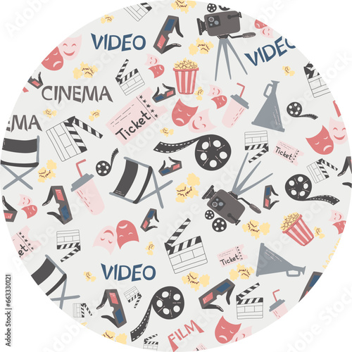 Colorful vector hand drawn set of Cinema cartoon doodle objects, symbols and items. Round frame composition from movie elements