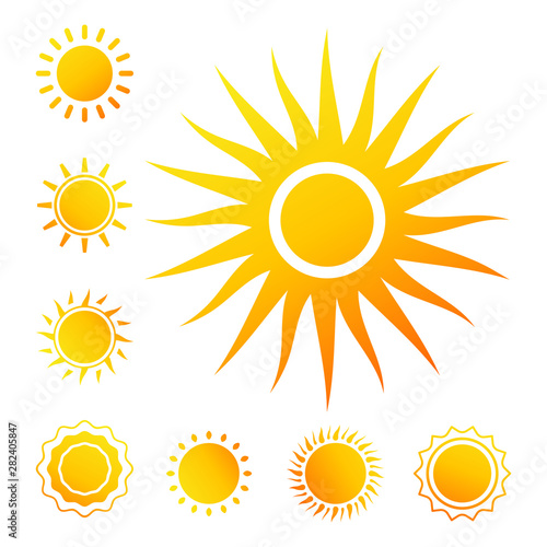 Colorful vector sun icons isolated on white background. Illustration sun summer collection, yellow sunlight