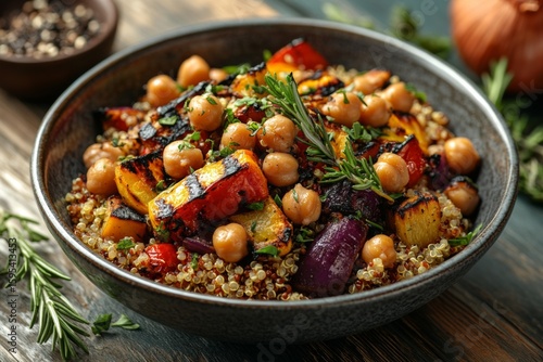 Colorful vegan bowl with quinoa avocado beans and fresh vegetables on wooden table