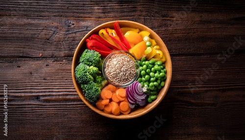 colorful vegetable and grain bowl on rustic wooden table possible use healthy food photography