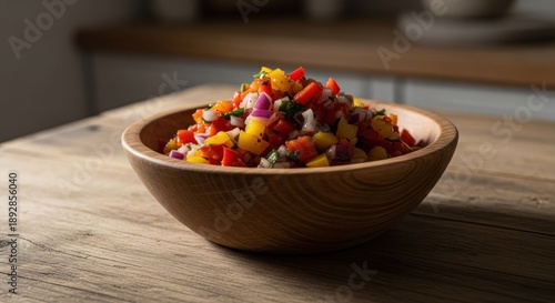 Colorful veggie salsa in wooden bowl on rustic wooden table, blurry background