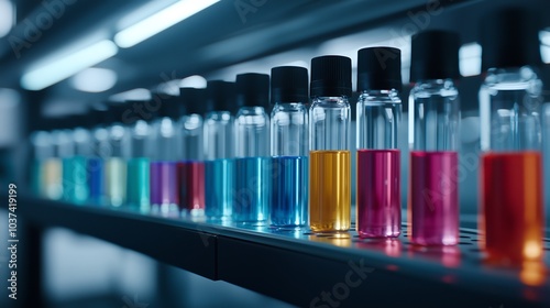 Colorful vials filled with various liquids are neatly arranged on a shelf, showcasing a spectrum of vibrant colors under controlled lighting.