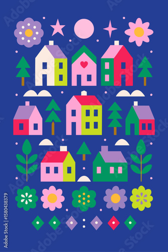 folk, village, house, colourful, naive, illustration, tree, decorative, city, vector, town, home, building, cartoon, castle, architecture, design, christmas, street, seamless, set, pattern, art, snow, night, roof, drawing, icon, window