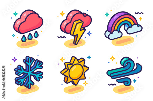 Colorful weather icons: rain, thunder, rainbow, snowflake, sun, wind