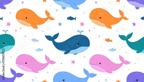 Colorful whales and fish create a playful, cheerful pattern on a white background.