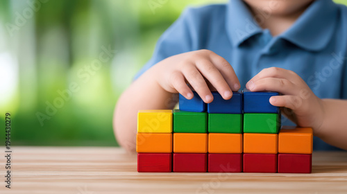 Colorful wooden blocks stacked by child hands on wooden table with blurred green background, playful learning and creativity in early childhood education