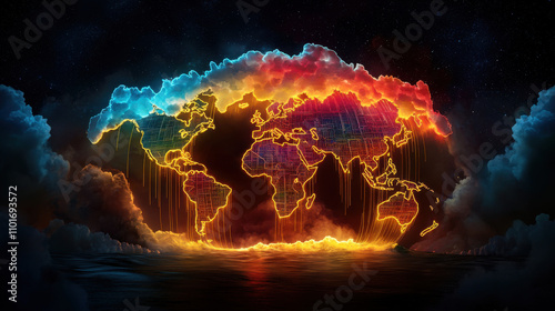 earth, map, climate, control, glowing, colourful, cloud, ocean, technology, global, network, environment, digital, abstract, illustration, earth, datum, visualisation, energy, design, futuristic, landscape, geography, bright, vibrant, atmosphere, light, connection, innovation, science, nature, planet, representation, modern, artistic, creative, concept, beauty, harmony, oneness, warmth, cool, temperature, spectrum, line