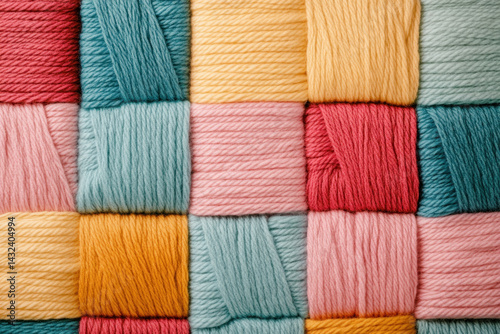 Colorful yarn in various shades is arranged in patchwork pattern, showcasing vibrant mix of textures and hues. This evokes creativity and warmth, perfect for crafting enthusiasts
