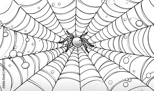 Coloring book page for kids and adults of a spider is sitting in the center of its web.