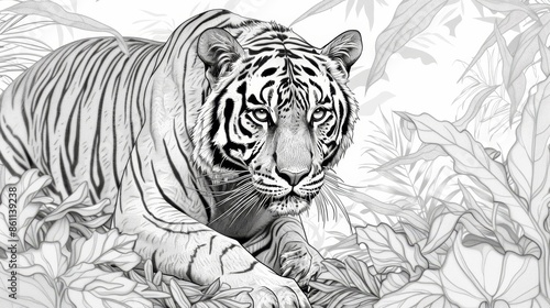 coloring book The image is a black and white sketch of a tiger walking through a jungle