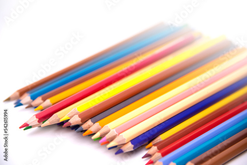 Colors pencils of many colors arranged in a row on a white background