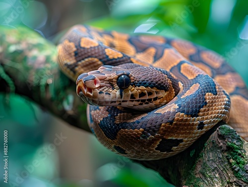 snake, boa, reptile, animal, tree, tree branch, forest, wildlife, nature, tropical, rainforest, predator, camouflage, coiled, scale, pattern, texture, environment, habitat, snake, python, fauna, ecosystem, green, foliage, canopy, wilderness, survival, power, strength, danger, wild