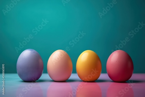 Colourful easter eggs on a table with blue background., Generative Ai