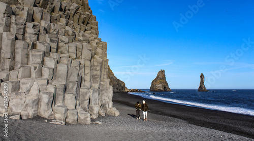 Columns of Basalt on the black sand beach of Reynisfjara in Iceland
