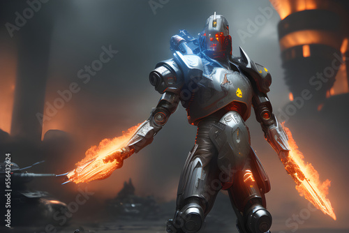 robot, warrior, knight, soldier, three-dimensional, armoring, fiction, fantasy, science, cyborg, android, metal, gun, weapon, helmet, science fiction, future, futuristic, flames, cyberspace