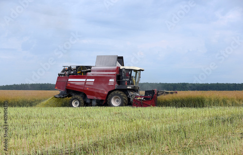 Combine harvester in a rapeseed field.Summer harvesting of grain crops.