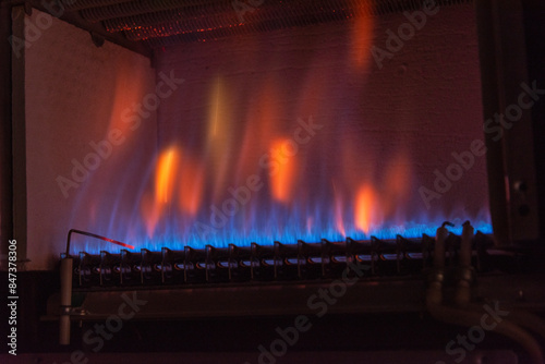 Combustión en el interior de una caldera de gas. Un quemador calienta un intercambiador de calor de cobre.