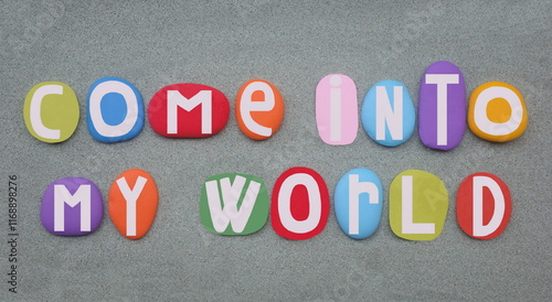 Come into my world, creative slogan design composed with multi colored hand painted stone letters over green sand