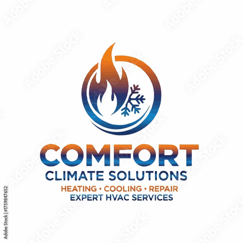 comfort, climate, solution, heating, cooling, repair, service, logotype, design, brand, fire, flames, snowflake, circle, orange, blue, text, typography, modern, professional, energy, efficiency, system, air, conditioning, maintenance, installation, expert, quality, accurateness, trust, client, satisfaction, residential, commercial, indoor, temperature, control, comfortable, environment, home, office, building, structure, industry, technology, innovation