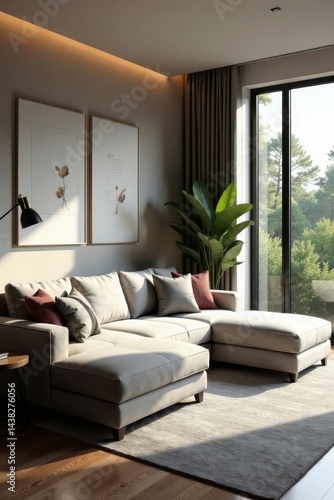 Comfortable sectional sofa, integrated workstation, natural light , home design, minimal decor, built in desk