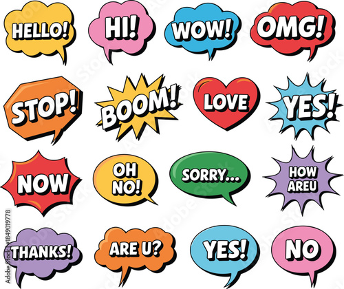 expression, sound, retro, cartoon, various, symbol, phrase, design, background, white, bubble, communication, text, thank, hallo, now, boom, untitled, bubble, speech, effect, word, fun, sorry, art, exclamation, comic, illustration, wow, message, love, word, dialogue, with, yes, style