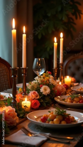 Comida para presentar en una mesa con velas y candelabros, platos, flores, mesa