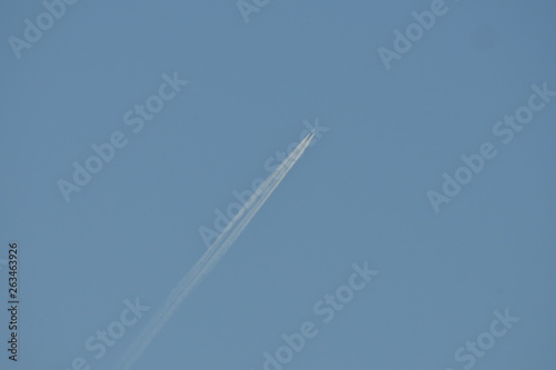 sky, plane, aeroplane, blue, jet, aircraft, trail, travel, aeroplane, flight, fly, air, condensation trail, wing, white, flying, cloud, transportation, cloud, trace, transport, high, vapour, clear, smoke, commercial, altitude, cloudless