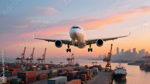 aeroplane, commercial, port, sunset, sky, orange, pink, blue, city, skyline, shipping, container, crane, ship, engine, wing, flight, realistic, balanced, scale, transport, cargo, aerial, aircraft, industry, harbor, landscape, travel, dusk, twilight, horizon, logistic, urban, cloud, vehicle, international, infrastructure, tied-up, background, vibrant, plane, jet, air, transportation, flying, fly, aerodrome, landing, airliner