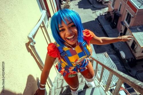 Commercial digital ads conceptual art art. Pretty happy mixed-race girl - for ads, banner and social apps use. Short trim - blue hair. Glamorous look. African women in ads. Colored woman.