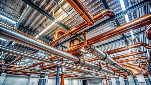 Commercial HVAC system components, including steel pipes, copper tubing, and valves, installed in a modern factory or warehouse's ceiling or rooftop space.