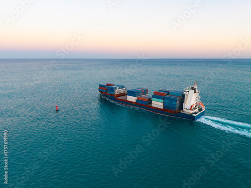 Commercial shipping. Cargo ship in sea, aerial view. Freight container loaded on cargo vessel. Aerial cargo ship with container. Cargo business. Container ship. Shipping logistics. Sailing the sea