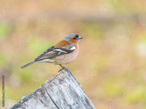 Common chaffinch, Fringilla coelebs, sits on a tree. Common chaffinch in wildlife.