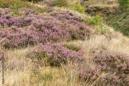 heather, common, blossom, bloom, blooming, flower, purple, hillside, hill, slope, landscape, nature, wildflower, flora, plant, vegetation, growth, dry, grass, bush, shrub, autumn, fall, scenic, vibrant, colours, natural, environment, ecosystem, outdoors, wild, uncultivated, field
