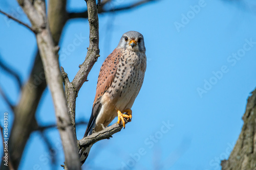 Common kestrel (Falco tinnunculus), male, perching on the branch on clear blue background. The wild bird of prey European kestrel or Eurasian kestrel sitting in full face against blue sky.