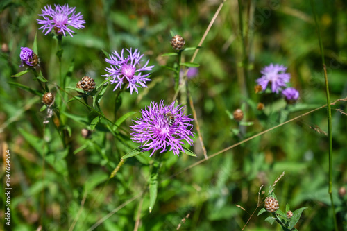 Common knapweed on meadow. Blooming Centaurea nigra. Bee on flower.
