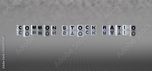 common stock ratio word or concept represented by black and white letter cubes on a grey horizon background stretching to infinity