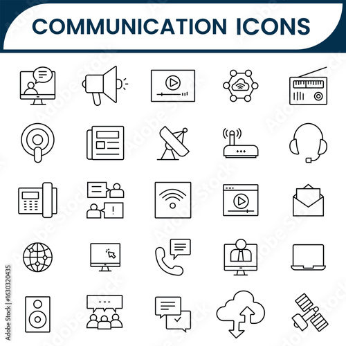 Communication icon set. Communication, connection, discussion, satellite, radio, antenna, speak, phone, satellight, mail, contact, chat, website and more. Solid icons collection, vector illustration.