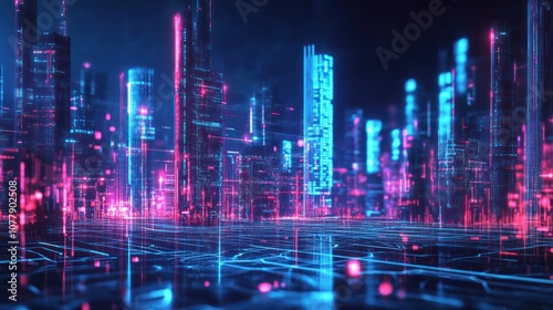 communication network, with glowing lines of light representing data transmission connecting various skyscrapers