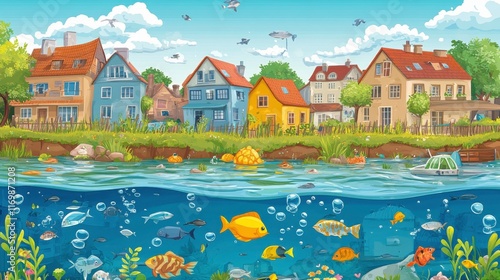 pollution, prevention, community, space, educational, environmental, urban, nature, water, fish, house, plant, bubble, interaction, sustainability, ecosystem, beauty, habitat, awareness, resource, conservation, education, landscape, ecology, artwork, illustration, vibrant, policy, aquatic, clean, health, quality, bright, responsibility, future, engagement, collaboration, diversity, oneness, activity, action, environment, preservation, cleanup, revitalization