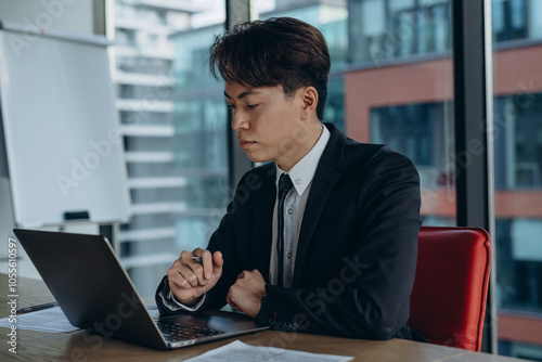 businessman, asian, laptop, office, work, computer, business, technology, suit, attaching, professional, man, corporate, executive, city, communication, cyberspace, type, keyboard, screen, desk, chair, entrepreneur, finance, stock, market, investment, analysis, datum, strategy, plan, meeting, presentation, success, career, overwork, ambition, sharpened, concentration, determination, confidence, leadership, management, window, company, growth, development, innovation, startup