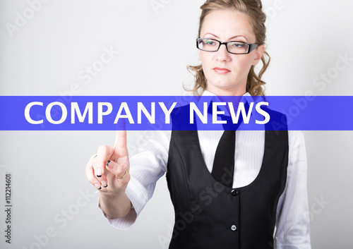company news written on a virtual screen. Internet technologies in business and tourism. woman in business suit and tie, presses a finger on a virtual screen