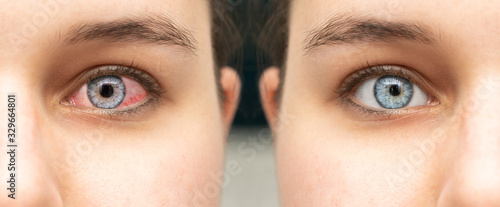 Comparison closeup view of eye before and after eyedrop treatment. Female red irritated eye. Mirroring view. Healthcare and eyecare concept...