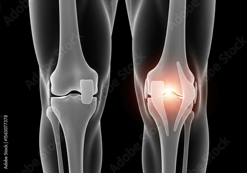 joint, x-ray, knee, pain, arthritis, bone, three-dimensional, inflammation, anatomy, orthopedics, medicals, illustration, render, radiology, scan, comparison, healthy, diseased, damaged, degradation, chronic, ageing, femur, cartilage, ligament, tendon, skeleton, system, diagnosis, health care, medicine, human, body, leg, before, after, glowing, black, isolated, clean, painful