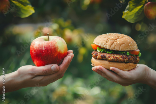 apple, burger, healthy, fast, food, comparison, choice, diet, nourishment, hand, holding, fresh, organic, fruit, junk, sesame, bun, decision, lifestyle, contrast, health, meal, snack, vegetable, calorie, balance, eating, option, red, yellow, green, fitness, obesity, fat, sugar, fiber, vitamin, processed, sweet, savoury, natural, weight, body, selection, hand, ingredient, delicious, calorie, protein