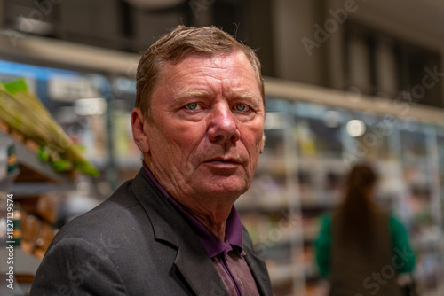 Compelling portrait of serious middle-aged man with blue eyes, dressed in purple shirt and dark suit jacket, captured candidly in softly blurred grocery store setting.