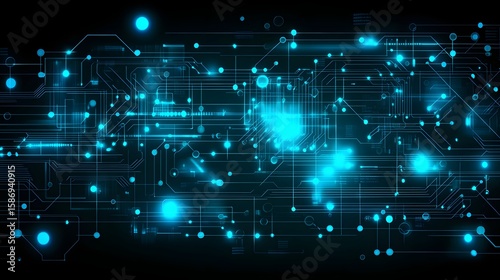 Complex circuit board design with glowing blue lines and points.