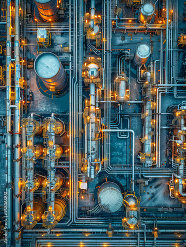 Complex network of pipes and tanks illuminating an industrial plant at night