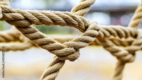 Complex web of interconnected ropes symbolizing intricate business relationships and antitrust challenges, with a focused foreground rope representing the effort to break monopolies.